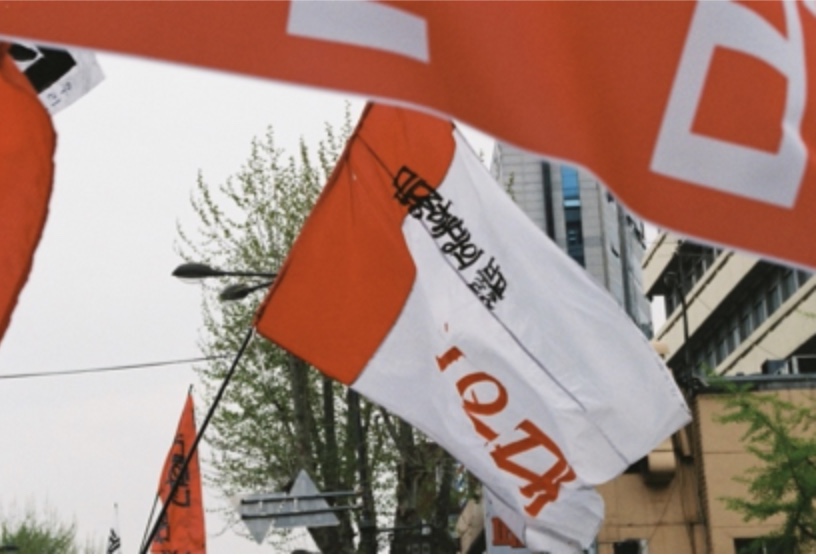 Flags, lots of white flags bearing black and bloody red slogans and affiliations like “the Flame of Minjung’s Liberation: Seoul National University Students Union” fly in a gentle yet chilly spring breeze. Sublime voices of protest songs about those who burned themselves to death in the struggle for Liberation in the ’80s make those still around feel guilty for being alive in this beautiful season. Students laugh and giggle, singing along to upbeat K-pop songs whose lyrics they’ve rewritten to challenge neoliberalism, the energy blooming alongside the colorful leaves of Gwanak Mountain.